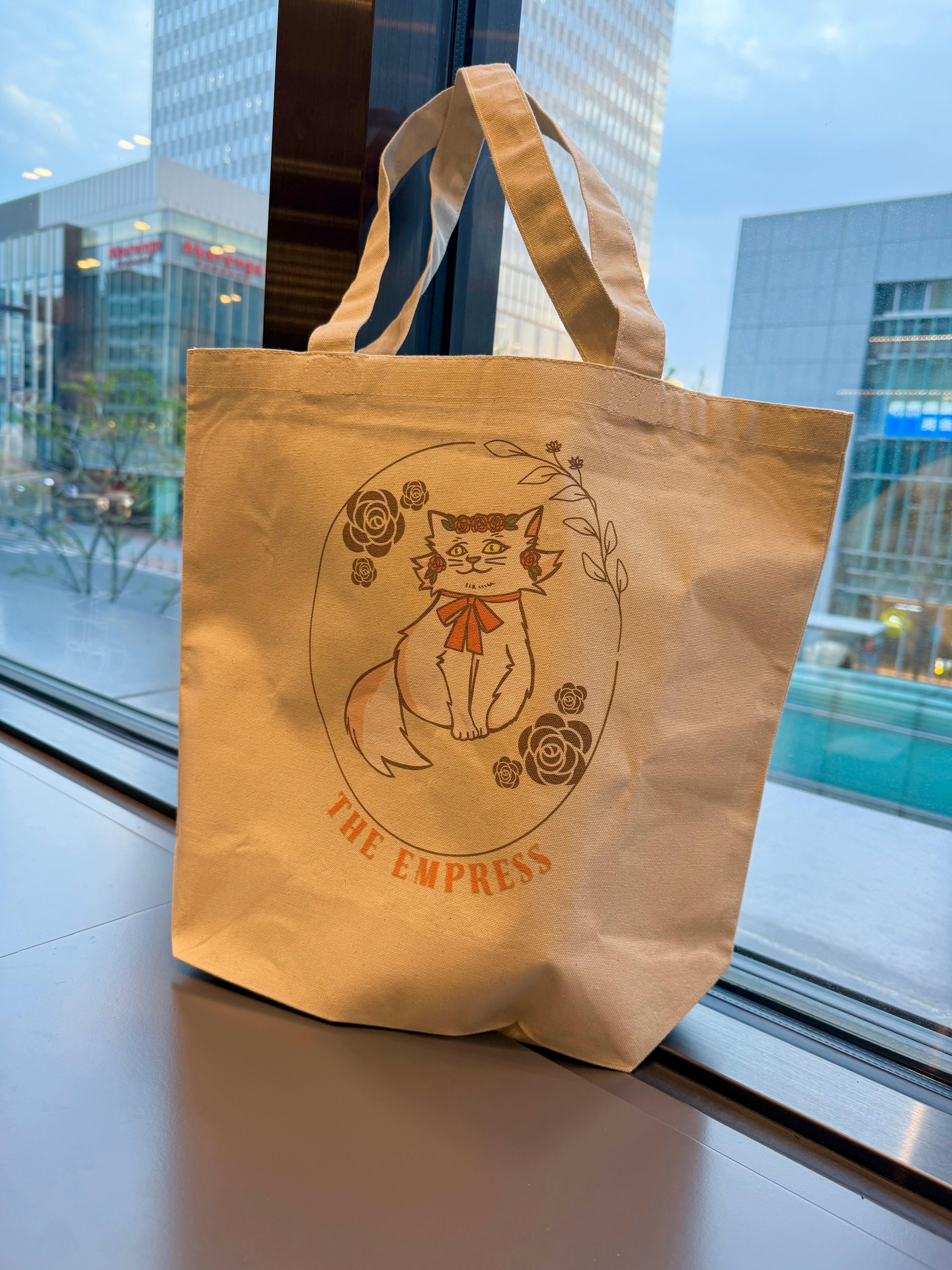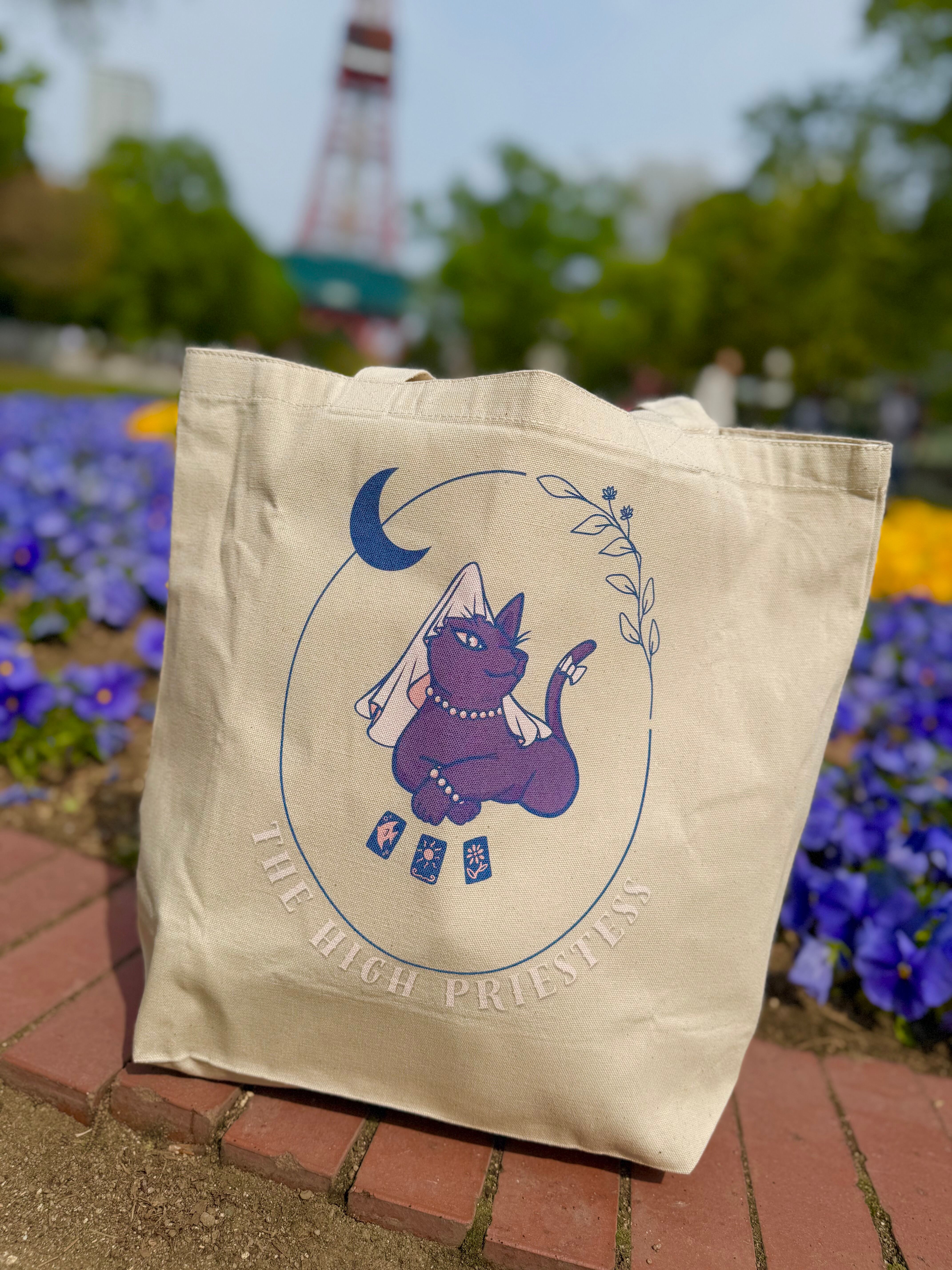 タロットカードの女教皇[THE HIGH PRIESTESS]と女帝[THE EMPRESS]をモチーフにした猫のイラストをプリントしたトートバッグ。